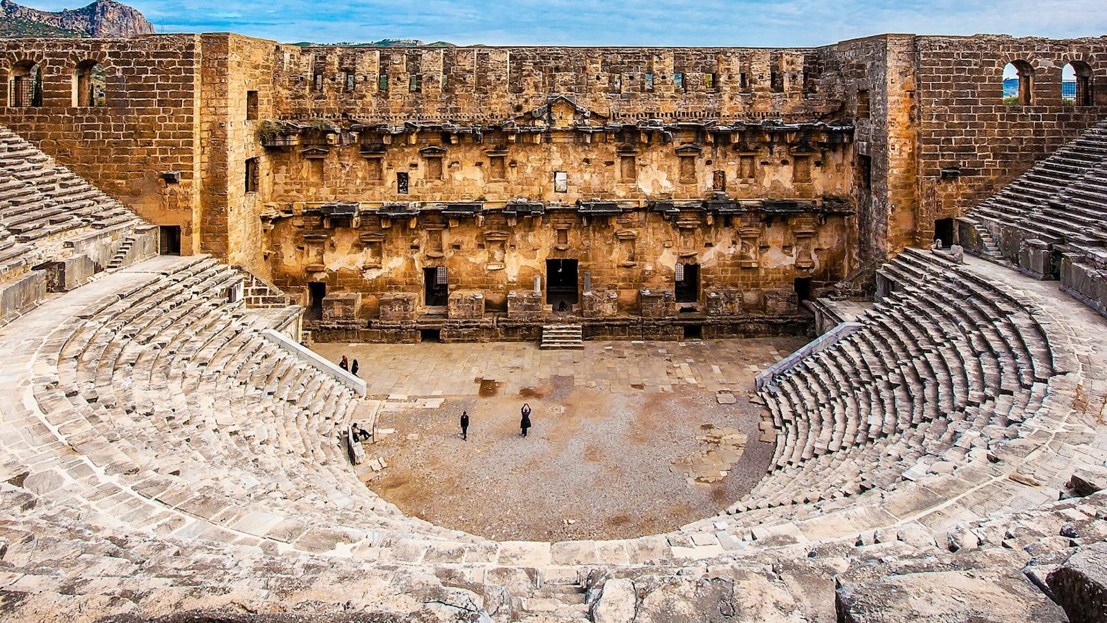 Manavgat’a 44 km mesafede 2. yy. da inşa edilen Aspendos Tiyatrosu 17.000 kişilik olup, günümüzde ayakta kalmış ve en iyi korunmuş amfi tiyatrodur. Sahnesi ile birlikte günümüze değin en iyi şekilde korunabilmiş nadir tiyatrolardandır. Günümüzde çeşitli konser, şenlik, festival ve yağlı güreşlerde kullanılmaktadır. Aspendos’ta diğer yapıların yanı sır Agora, Bazilika, Nypmphaeum ve 15 km. uzunluğunda kemerli su yolları görülmeye değer yapılardır.